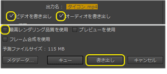 | 5. 〔ビデオを書き出し〕と〔オーディオを書き出し〕の左のボックスにチェックマークがついていることを確認します。ついていない場合には、クリックしてチェックマークをつけます。必要に応じて〔最高レンダリング品質を使用〕にチェックマークをつけ、〔書き出し〕ボタンをクリックします。 | ![]() |