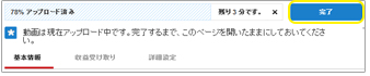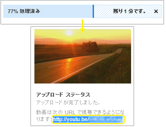 | 11. 処理が終了したら、左にある〔アップロード ステイタス〕に映像が表示されるので、その下に表示されるURLをコピーして分かりやすい場所に保存して下さい。 | ![]() |