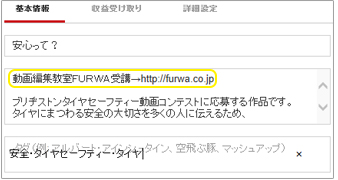 | 9. 基本情報のページが開くので、作品のタイトルを入力します。次に、FURWAからタイコンに応募したことが分かるように、説明の1行目に〔動画編集教室FURWA受講→http://furwa.co.jp〕と入力し、その下の行に作品の説明文を入力します。なお、検索に影響があるタグは必要に応じて入力下さい。 | ![]() |