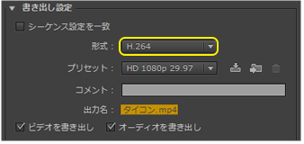| 2.〔書き出し設定〕のダイアログボックスが開くので、動画の〔形式〕を〔H.264〕に設定します。 | ![]() |