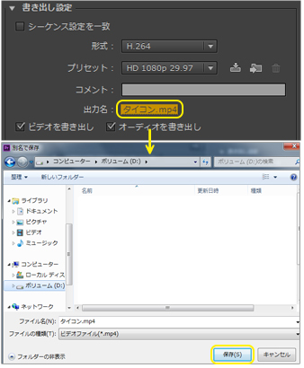 | 4. 保存先を指定するために、〔出力名〕の右隣のオレンジ表記の文字をクリックし、保存先のフォルダーを開いて〔ファイル名〕を入力後、〔保存〕ボタンをクリックします。 | ![]() |