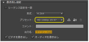 | 3.〔プリセット〕は、〔HD 1080p 29.97〕に設定します。 (サイズをおさえたい場合には、〔You Tube HD 1080p 29.97〕を選択します) |