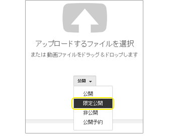 | 8. アップロードのページが開くので、〔公開〕をクリックして〔限定公開〕に変更した後、〔アップロードするファイルを選択〕ボタンをクリックして、作品名のファイルを選択するか、ファイルをドラッグ&ドロップします。 | ![]() |