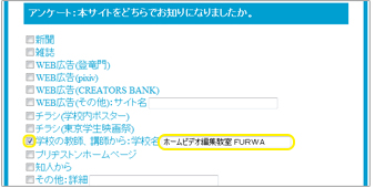 | 14. 〔アンケート〕の〔学校の教師、講師から:学校名〕にチェックマークをつけ、〔ホームビデオ編集教室FURWA〕と入力下さい。 | ![]() |