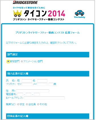 | 12. https://cs.bridgestone.co. jp/webapp/form/17785_biab_1/ index.doにアクセスすると、タイコンの応募フォームのページが開くので、〔部門選定〕で〔実写部門〕の左にある丸をクリックして印をつけ、〔個人応募の記入欄〕に必要事項をすべて記入します。 |