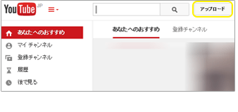 | 7. http://www.youtube.com/ にアクセスすると、You Tubeが開くので、 右上にある〔アップロード〕ボタンをクリックします。 (ログインしていない方は、〔アップロード〕ボタンの右にある〔ログイン〕ボタンをクリックしてアカウントを選択する必要があります) |