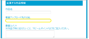 | 13. 〔応募する作品情報〕の〔動画アップロード先のURL〕に先ほど11でコピーしたURLをペーストし、作品名と動画コメントを入力します。 | ![]() |